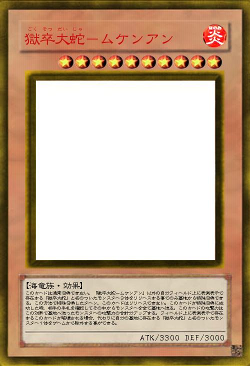 | このカードは通常召喚できない。「獄卒大蛇-ムケンアン」以外の自分フィールド上に表側表示で存在する「獄卒大蛇」と名のついたモンスター3体をリリースする事でのみ墓地から特殊召喚できる。この方法で特殊召喚したターン、このカードはリリースできない。このカードが特殊召喚に成功した時、相手の手札を確認してその中からモンスターを全て墓地へ送る。このカードの攻撃力はこの効果で墓地へ送ったモンスターの攻撃力の合計分アップする。フィールド上に表側表示で存在するこのカードが破壊される場合、代わりに自分の墓地に存在する「獄卒大蛇」と名のついたモンスター1体をゲームから除外する事ができる。 | |||