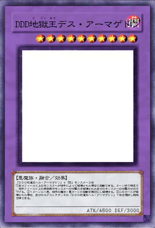 「DDD死偉王ヘル・アーマゲドン」+「DD」モンスター2体 ①自分フィールド上のモンスターが相手によって破壊された場合に発動できる。ターン終了時まで、相手フィールド上の表側表示モンスターの攻撃力を破壊された自分のモンスターの攻撃力分だけ下げる。②1ターンに1度、相手の魔法・罠カードの発動を無効にし破壊する。③このカードが破壊された場合、自分のエクストラデッキの「DDD死偉王ヘル・アーマゲドン」1体を選択し特殊召喚できる。 |