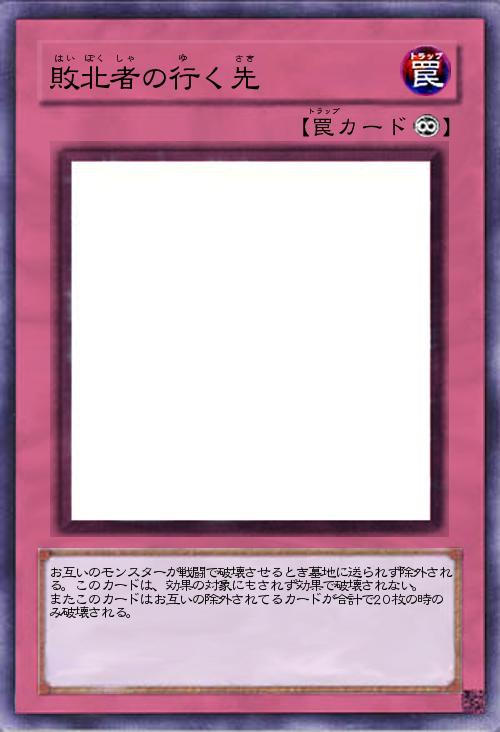 お互いのモンスターが戦闘で破壊させるとき墓地に送られず除外される。このカードは、効果の対象にもされず効果で破壊されない。 またこのカードはお互いの除外されてるカードが合計で20枚の時のみ破壊される。 |
