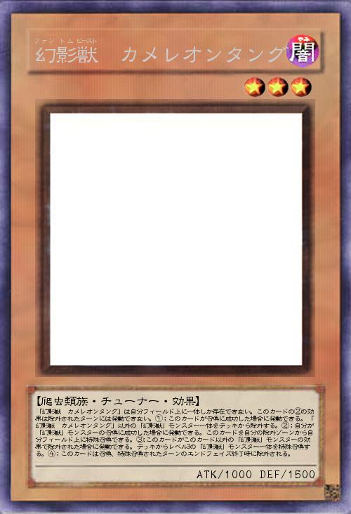 | 「幻影獣 カメレオンタング」は自分フィールド上に一体しか存在できない。このカードの②の効果は除外されたターンには発動できない。①;このカードが召喚に成功した場合に発動できる。「幻影獣 カメレオンタング」以外の「幻影獣」モンスター一体をデッキから除外する。②;自分が「幻影獣」モンスターの召喚に成功した場合に発動できる。このカードを自分の除外ゾーンから自分フィールド上に特殊召喚できる。③;このカードがこのカード以外の「幻影獣」モンスターの効果で除外された場合に発動できる。デッキからレベル3の「幻影獣」モンスター一体を特殊召喚する。④;このカードは召喚、特殊召喚されたターンのエンドフェイズ終了時に除外される。 | |||