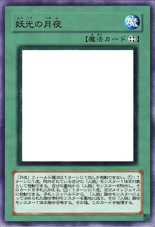 | 「月夜」フィールド魔法は1ターンに1枚しか発動できない。①:1ターンに1度、除外されている自分の「人狼」モンスター1体を対象として発動できる。自分の墓地から「人狼」モンスターを除外し、そのカードを手札に加える。②:1ターンに1度、自分メインフェイズに発動できる。手札・フィールドから、「人狼」融合モンスターによって決められた融合素材モンスターを墓地に送り、その「人狼」融合モンスター1体を融合召喚する。その後、このカードを破壊する。 | |||