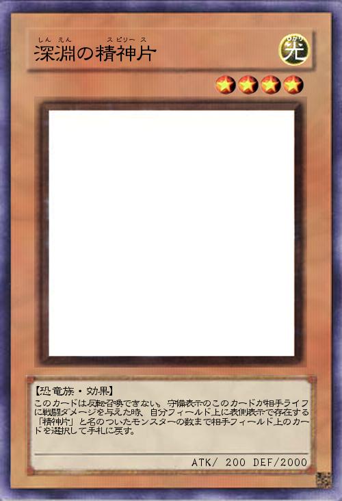 | このカードは反転召喚できない。守備表示のこのカードが相手ライフに戦闘ダメージを与えた時、自分フィールド上に表側表示で存在する「精神片」と名のついたモンスターの数まで相手フィールド上のカードを選択して手札に戻す。 | |||