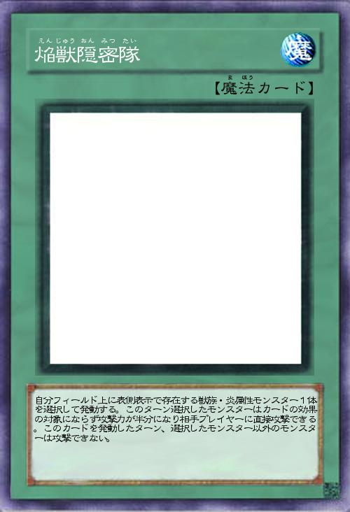 | 自分フィールド上に表側表示で存在する獣族・炎属性モンスター1体を選択して発動する。このターン選択したモンスターはカードの効果の対象にならず攻撃力が半分になり相手プレイヤーに直接攻撃できる。このカードを発動したターン、選択したモンスター以外のモンスターは攻撃できない。 | |||