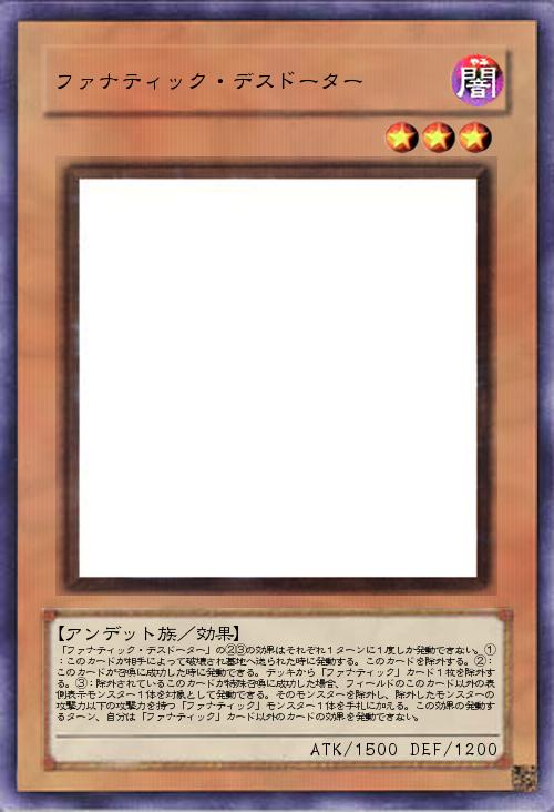 | 「ファナティック・デスドーター」の②③の効果はそれぞれ1ターンに1度しか発動できない。①:このカードが相手によって破壊され墓地へ送られた時に発動する。このカードを除外する。②:このカードが召喚に成功した時に発動できる。デッキから「ファナティック」カード1枚を除外する。③:除外されているこのカードが特殊召喚に成功した場合、フィールドのこのカード以外の表側表示モンスター1体を対象として発動できる。そのモンスターを除外し、除外したモンスターの攻撃力以下の攻撃力を持つ「ファナティック」モンスター1体を手札に加える。この効果の発動するターン、自分は「ファナティック」カード以外のカードの効果を発動できない。 | |||