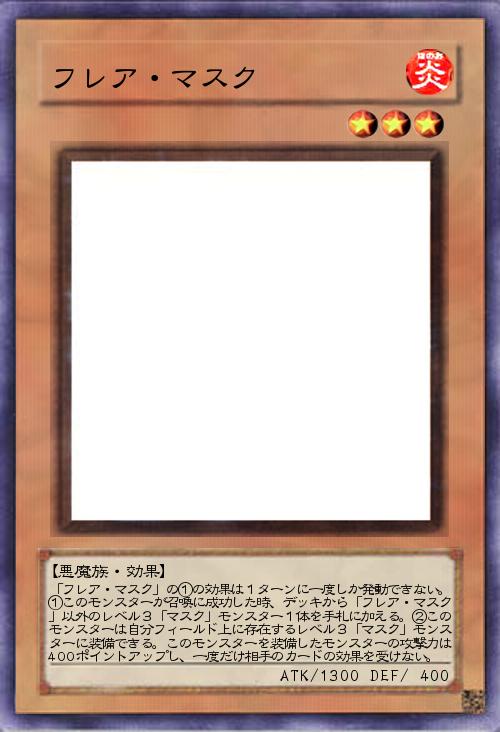 | 「フレア・マスク」の①の効果は1ターンに一度しか発動できない。①このモンスターが召喚に成功した時、デッキから「フレア・マスク」以外のレベル3「マスク」モンスター1体を手札に加える。②このモンスターは自分フィールド上に存在するレベル3「マスク」モンスターに装備できる。このモンスターを装備したモンスターの攻撃力は400ポイントアップし、一度だけ相手のカードの効果を受けない。 | |||