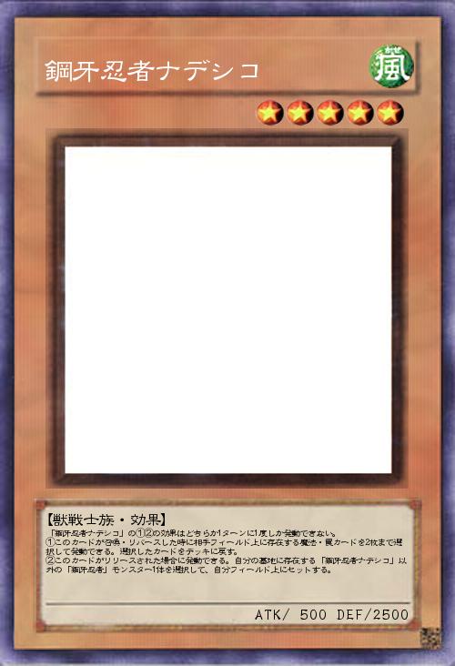「鋼牙忍者ナデシコ」の①②の効果はどちらか1ターンに1度しか発動できない。 ①このカードが召喚・リバースした時に相手フィールド上に存在する魔法・罠カードを2枚まで選択して発動できる。選択したカードをデッキに戻す。 ②このカードがリリースされた場合に発動できる。自分の墓地に存在する「鋼牙忍者ナデシコ」以外の「鋼牙忍者」モンスター1体を選択して、自分フィールド上にセットする。 |