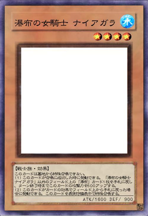 このカードは墓地から特殊召喚できない。 (1)このカードが召喚に成功した時に発動できる。「瀑布の女騎士 ナイアガラ」以外のフィールド上の「瀑布」カード1枚を手札に戻し、ターン終了時までこのカードの攻撃力を500アップする。 (2)このカードがカードの効果でフィールド上から手札に戻った場合に発動できる。このカードを表側守備表示で特殊召喚する。 |