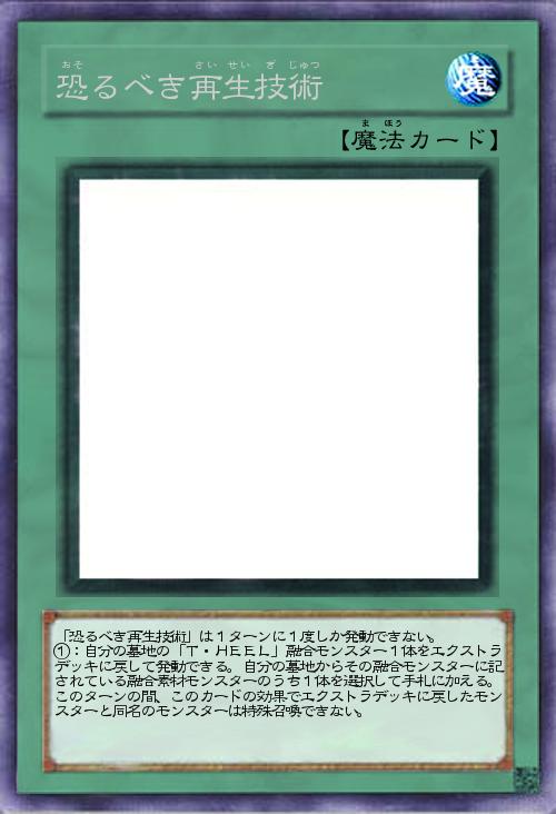 「恐るべき再生技術」は1ターンに1度しか発動できない。 ①:自分の墓地の「T・HEEL」融合モンスター1体をエクストラデッキに戻して発動できる。自分の墓地からその融合モンスターに記されている融合素材モンスターのうち1体を選択して手札に加える。このターンの間、このカードの効果でエクストラデッキに戻したモンスターと同名のモンスターは特殊召喚できない。 |