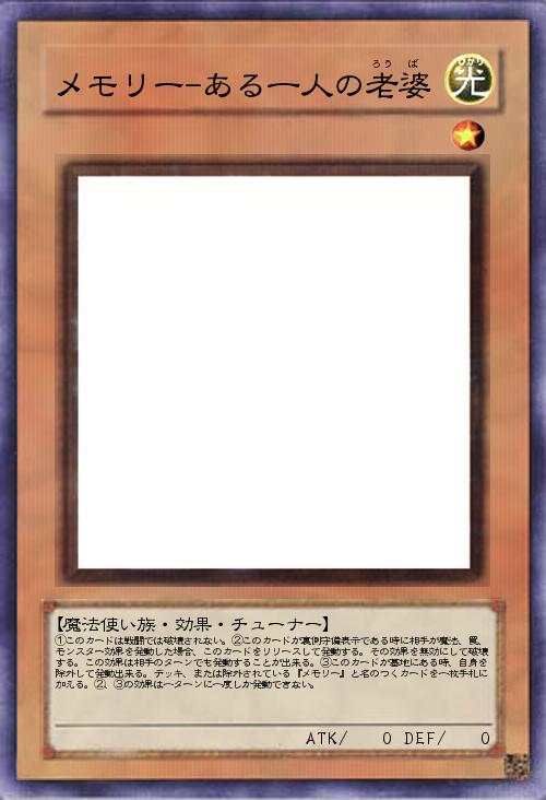 | ①このカードは戦闘では破壊されない。②このカードが裏側守備表示である時に相手が魔法、罠、モンスター効果を発動した場合、このカードをリリースして発動する。その効果を無効にして破壊する。この効果は相手のターンでも発動することが出来る。③このカードが墓地にある時、自身を除外して発動出来る。デッキ、または除外されている『メモリー』と名のつくカードを一枚手札に加える。②、③の効果は一ターンに一度しか発動できない。 | |||