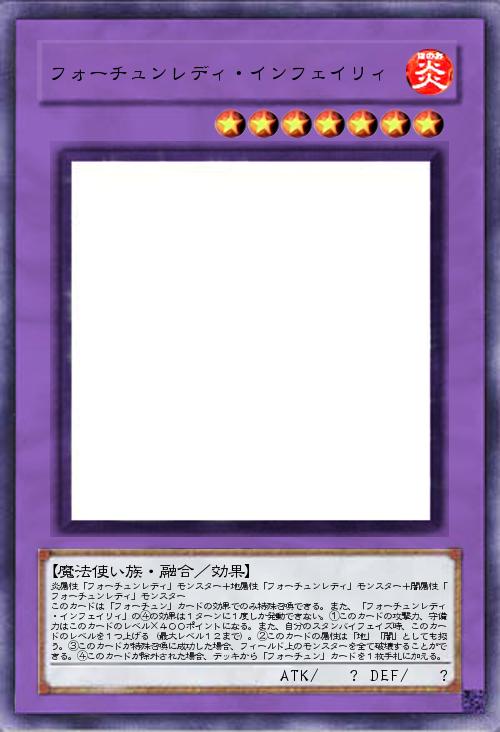 炎属性「フォーチュンレディ」モンスター+地属性「フォーチュンレディ」モンスター+闇属性「フォーチュンレディ」モンスター このカードは「フォーチュン」カードの効果でのみ特殊召喚できる。また、「フォーチュンレディ・インフェイリィ」の④の効果は1ターンに1度しか発動できない。①このカードの攻撃力、守備力はこのカードのレベル×400ポイントになる。また、自分のスタンバイフェイズ時、このカードのレベルを1つ上げる(最大レベル12まで)。②このカードの属性は「地」「闇」としても扱う。③このカードが特殊召喚に成功した場合、フィールド上のモンスターを全て破壊することができる。④このカードが除外された場合、デッキから「フォーチュン」カードを1枚手札に加える。 |