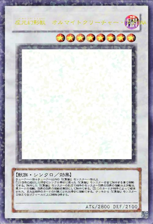 チューナー一体+チューナー以外の「幻影獣」モンスター一体以上 ①;S召喚に成功した場合にシンクロ素材に使った「幻影獣」モンスターを全て除外する事で発動できる。除外した「幻影獣」モンスターの数まで相手のモンスター効果の効果の発動および魔法、罠カードの発動、効果の効果の発動を無効にして除外できる。②;このカードが相手によって破壊された、または相手のカードの対象にされた場合に発動できる。デッキから「幻影獣」モンスター2体まで自分フィールド上に特殊召喚する。 |