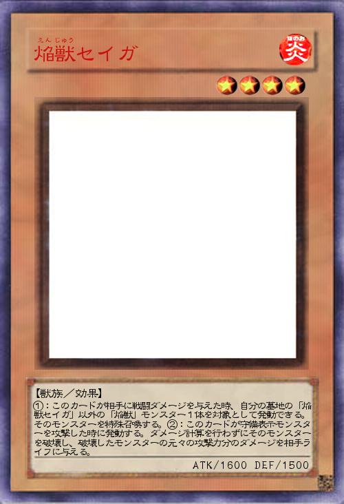 | ①:このカードが相手に戦闘ダメージを与えた時、自分の墓地の「焔獣セイガ」以外の「焔獣」モンスター1体を対象として発動できる。そのモンスターを特殊召喚する。②:このカードが守備表示モンスターを攻撃した時に発動する。ダメージ計算を行わずにそのモンスターを破壊し、破壊したモンスターの元々の攻撃力分のダメージを相手ライフに与える。 | |||
