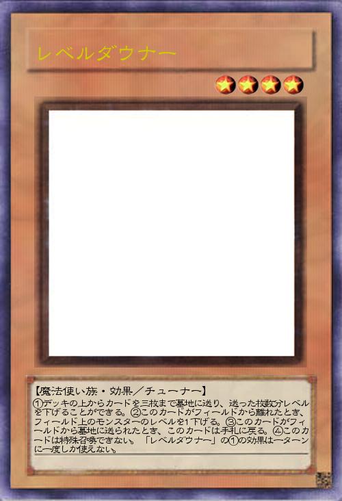 | ①デッキの上からカードを三枚まで墓地に送り、送った枚数分レベルを下げることができる。②このカードがフィールドから離れたとき、フィールド上のモンスターのレベルを1下げる。③このカードがフィールドから墓地に送られたとき、このカードは手札に戻る。④このカードは特殊召喚できない。「レベルダウナー」の①の効果は一ターンに一度しか使えない。 | |||