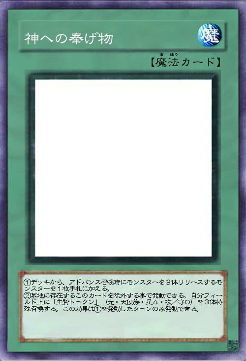 ①デッキから、アドバンス召喚時にモンスターを3体リリースするモンスターを1枚手札に加える。 ②墓地に存在するこのカードを除外する事で発動できる。自分フィールド上に「生贄トークン」(光・天使族・星4・攻/守0)を3体特殊召喚する。この効果は①を発動したターンのみ発動できる。 |