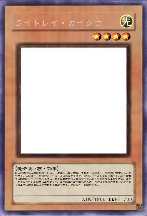 | 自分の墓地に光属以外のモンスターが存在しない場合、手札からこのカードを特殊召喚することができる。このカードが自分フィールド上に存在する限り、自分フィールド上の光属モンスターが相手に戦闘ダメージを与える度に、相手の墓地から2枚までモンスターを除外する事ができる。また、相手のカードが効果によりデッキ、または墓地から離れたとき、自分の手札の光属モンスターを1枚墓地に送る事により発動する事ができる。そのカードを除外する。 | |||