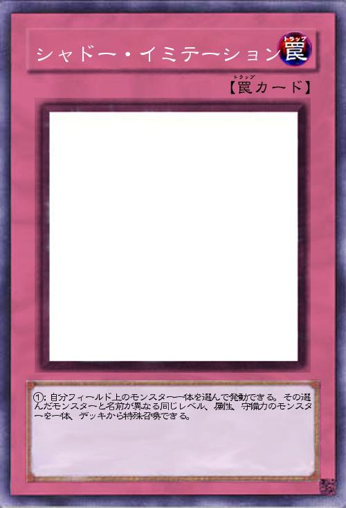 | ①;自分フィールド上のモンスター一体を選んで発動できる。その選んだモンスターと名前が異なる同じレベル、属性、守備力のモンスターを一体、デッキから特殊召喚できる。 | |||