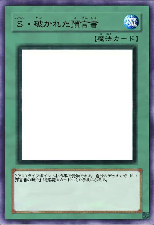 | ①800ライフポイント払う事で発動できる。自分のデッキから「S・預言書の断片」通常魔法カード1枚を手札に加える。 | |||