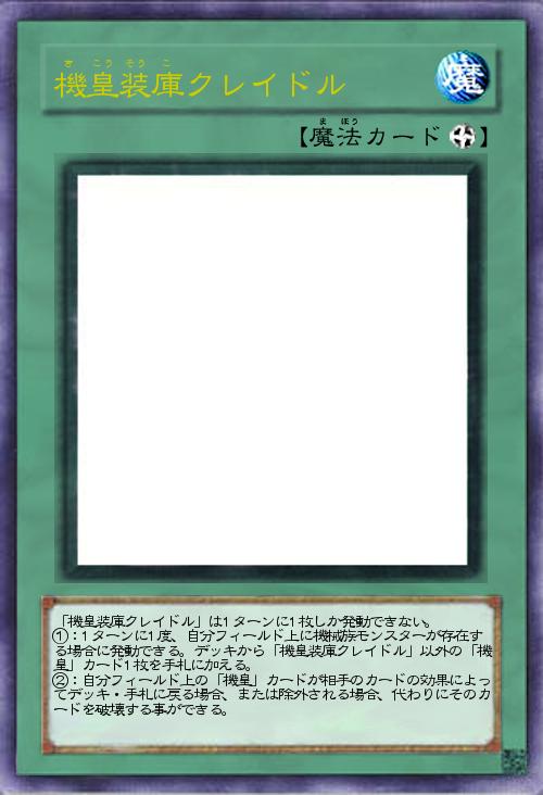 「機皇装庫クレイドル」は1ターンに1枚しか発動できない。 ①:1ターンに1度、自分フィールド上に機械族モンスターが存在する場合に発動できる。デッキから「機皇装庫クレイドル」以外の「機皇」カード1枚を手札に加える。 ②:自分フィールド上の「機皇」カードが相手のカードの効果によってデッキ・手札に戻る場合、または除外される場合、代わりにそのカードを破壊する事ができる。 |