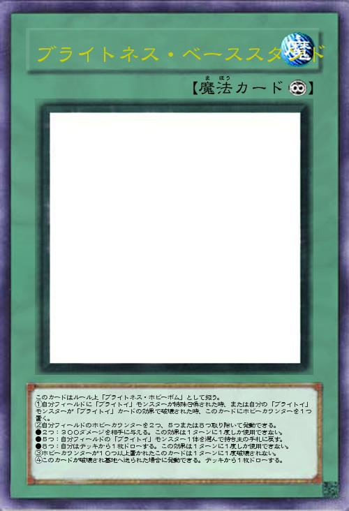 このカードはルール上「ブライトネス・ホビーボム」として扱う。 ①自分フィールドに「ブライトイ」モンスターが特殊召喚された時、または自分の「ブライトイ」モンスターが「ブライトイ」カードの効果で破壊された時、このカードにホビーカウンターを1つ置く。 ②自分フィールドのホビーカウンターを2つ、5つまたは8つ取り除いて発動できる。 ●2つ:300ダメージを相手に与える。この効果は1ターンに1度しか使用できない。 ●5つ:自分フィールドの「ブライトイ」モンスター1体を選んで持ち主の手札に戻す。 ●8つ:自分はデッキから1枚ドローする。この効果は1ターンに1度しか使用できない。 ③ホビーカウンターが10つ以上置かれたこのカードは1ターンに1度破壊されない。 ④このカードが破壊され墓地へ送られた場合に発動できる。デッキから1枚ドローする。 |