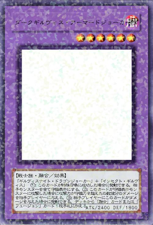 | 「ギルヴィスナイト・ドラゴンジョーカー」+「インセクト・ギルヴィス」 ①;このカードが特殊召喚に成功した場合に発動できる。相手モンスターを全て守備表示にする。②;このカードが守備表示モンスターに攻撃した場合に攻撃力が守備力を超えたの数値分のダメージを相手プレイヤーに与える。③;相手プレイヤーにこのカードがダメージを与えた場合に発動できる。デッキから「融合」カードまたは「フュージョン」カード1枚手札に加える。 | |||
