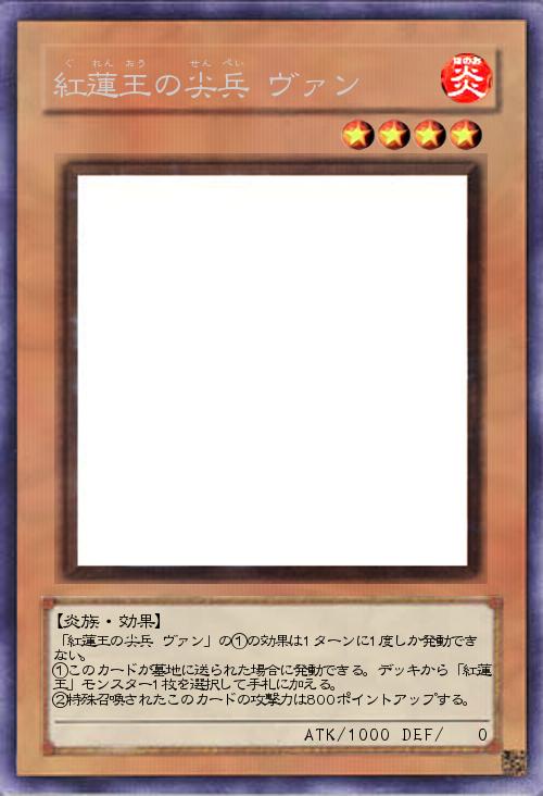 「紅蓮王の尖兵 ヴァン」の①の効果は1ターンに1度しか発動できない。 ①このカードが墓地に送られた場合に発動できる。デッキから「紅蓮王」モンスター1枚を選択して手札に加える。 ②特殊召喚されたこのカードの攻撃力は800ポイントアップする。 |