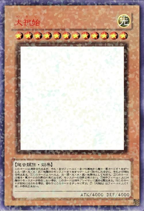 | このカードは通常召喚出来ず、手札・自分フィールド・自分の墓地から魔法・罠カードを1枚ずつと炎・闇・光・水・風・地属性のモンスターを1枚ずつゲームから除外した場合に、手札から特殊召喚出来る。①このカードはルール上、炎・闇・光・水・風・地属性としても扱う。②このカードは魔法・罠カードの効果の対象にならず、モンスターの効果を受けない。③相手フィールド上に神属性のモンスターが存在しない場合、このカードは相手プレイヤーに直接攻撃出来る。④このカードが墓地に送られる場合、替わりにこのカードをデッキに戻す。⑤「大祖始」はフィールド上に1枚しか存在出来ない。 | |||