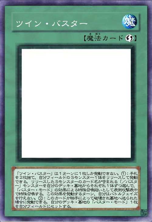 | 「ツイン・バスター」は1ターンに1枚しか発動できない。①:手札を2枚捨て、自分フィールドのSモンスター1体をリリースして発動できる。リリースしたSモンスターのカード名が含まれる「/バスター」モンスターを自分のデッキ・墓地からそれぞれ1体ずつ選んで、「バスター・モード」の効果による特殊召喚扱いとして表側攻撃表示で特殊召喚する。この効果を発動するターン、自分はバトルフェイズを行えない。②:このカードが相手によって破壊され墓地へ送られた場合に発動できる。自分のデッキ・墓地の「バスター・モード」1枚を自分フィールドにセットする。 | |||