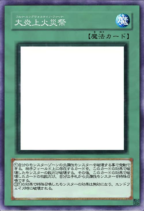 ①自分のモンスターゾーンの炎属性モンスターを破壊する事で発動できる。相手フィールド上に存在するカードを、このカードの効果で破壊したモンスターの数だけ破壊する。その後、このカードの効果で破壊したカードの枚数だけ、自分は手札から炎属性モンスターを特殊召喚できる。 ②①の効果で特殊召喚したモンスターの効果は無効になり、エンドフェイズ時に破壊される。 |