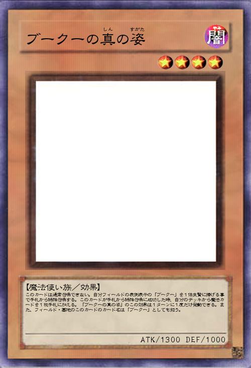 | このカードは通常召喚できない。自分フィールドの表側表示の「ブークー」を1体生贄に捧げる事で手札から特殊召喚する。このカードが手札から特殊召喚に成功した時、自分のデッキから魔法カードを1枚手札に加える。「ブークーの真の姿」のこの効果は1ターンに1度だけ発動できる。また、フィールド・墓地のこのカードのカード名は「ブークー」としても扱う。 | |||