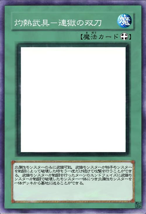 | 炎属性モンスターのみに装備可能。装備モンスターが相手モンスターを戦闘によって破壊した時もう一度だけ続けて攻撃を行うことができる。装備モンスターが戦闘を行ったターンのエンドフェイズに装備モンスターが戦闘で破壊したモンスター一体につき炎属性モンスターを一体デッキから墓地に送ることができる。 | |||