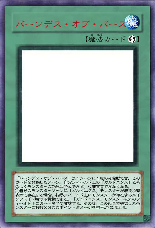 「バーンデス・オブ・バース」は1ターンに1度のみ発動でき、このカードを発動したターン、自分フィールド上の「ガルドニクス」と名のつくモンスターの効果は発動できず、攻撃宣言できなくなる。 ①自分のモンスターゾーンに「ガルドニクス」モンスターが表側攻撃表示で存在する場合、相手フィールド上にモンスターが存在するメインフェイズ時のみ発動できる。「ガルドニクス」モンスター以外のフィールド上のカードを全て破壊する。その後、この効果で破壊したモンスターの枚数×300ポイントダメージを相手LPに与える。 |