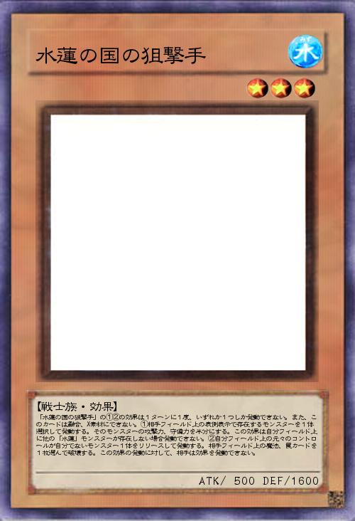 | 「水蓮の国の狙撃手」の①②の効果は1ターンに1度、いずれか1つしか発動できない。また、このカードは融合、X素材にできない。①相手フィールド上の表側表示で存在するモンスターを1体選択して発動する。そのモンスターの攻撃力、守備力を半分にする。この効果は自分フィールド上に他の「水蓮」モンスターが存在しない場合発動できない。②自分フィールド上の元々のコントロールが自分でないモンスター1体をリリースして発動する。相手フィールド上の魔法、罠カードを1枚選んで破壊する。この効果の発動に対して、相手は効果を発動できない。 | |||