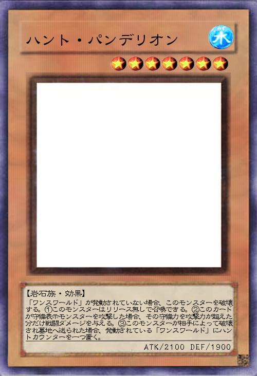 | 「ワンスワールド」が発動されていない場合、このモンスターを破壊する。①このモンスターはリリース無しで召喚できる。②このカードが守備表示モンスターを攻撃した場合、その守備力を攻撃力が超えた分だけ戦闘ダメージを与える。③このモンスターが相手によって破壊され墓地へ送られた場合、発動されている「ワンスワールド」にハントカウンターを一つ置く。 | |||
