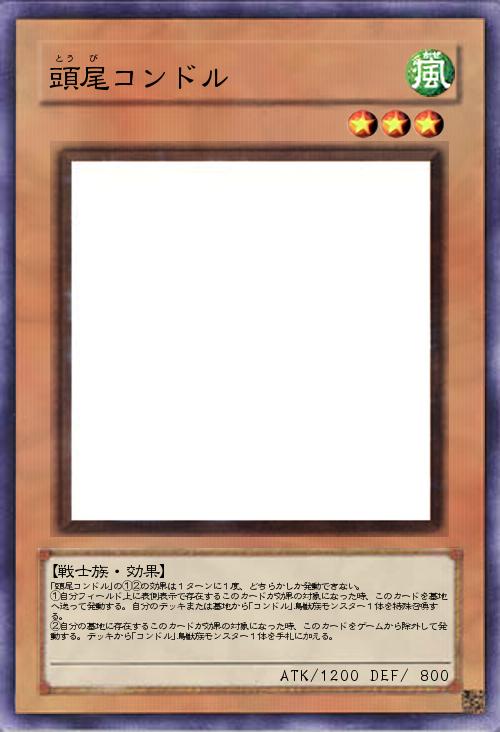 「頭尾コンドル」の①②の効果は1ターンに1度、どちらかしか発動できない。 ①自分フィールド上に表側表示で存在するこのカードが効果の対象になった時、このカードを墓地へ送って発動する。自分のデッキまたは墓地から「コンドル」鳥獣族モンスター1体を特殊召喚する。 ②自分の墓地に存在するこのカードが効果の対象になった時、このカードをゲームから除外して発動する。デッキから「コンドル」鳥獣族モンスター1体を手札に加える。 |