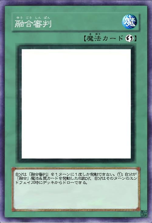 | 自分は「融合審判」を1ターンに1度しか発動できない。①;自分が「融合」魔法&罠カードを発動した枚数分、自分はそのターンのエンドフェイズ時にデッキからドローできる。 | |||