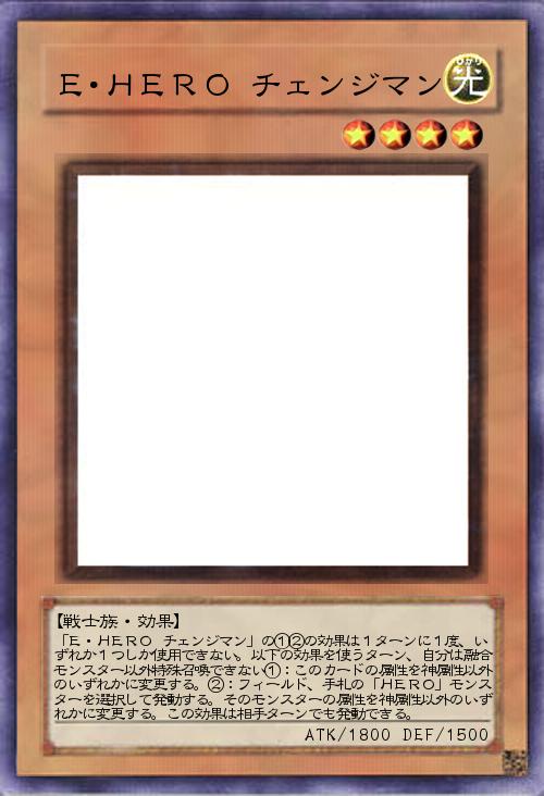 | 「E・HERO チェンジマン」の①②の効果は1ターンに1度、いずれか1つしか使用できない。以下の効果を使うターン、自分は融合モンスター以外特殊召喚できない①:このカードの属性を神属性以外のいずれかに変更する。②:フィールド、手札の「HERO」モンスターを選択して発動する。そのモンスターの属性を神属性以外のいずれかに変更する。この効果は相手ターンでも発動できる。 | |||