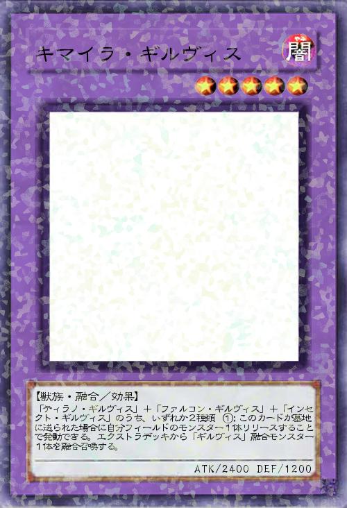 | 「ティラノ・ギルヴィス」+「ファルコン・ギルヴィス」+「インセクト・ギルヴィス」のうち、いずれか2種類 ①;このカードが墓地に送られた場合に自分フィールドのモンスター1体リリースすることで発動できる。エクストラデッキから「ギルヴィス」融合モンスター1体を融合召喚する。 | |||