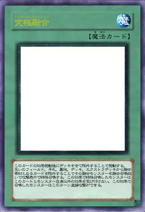 このカードの効果発動後にデッキを全て除外することで発動する。 互いのフィールド、手札、墓地、デッキ、エクストラデッキから融合素材となるカードを除外することでその融合モンスターを融合召喚扱いで攻撃表示で特殊召喚する。この効果で特殊召喚したモンスターはこのカードとモンスター自身以外の効果を受け付けない。この効果で召喚したモンスターはこのターン直接攻撃ができる。 |