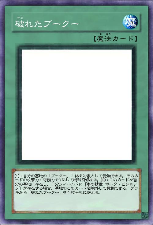 | ①:自分の墓地の「ブークー」1体を対象として発動できる。そのカードの攻撃力・守備力を0にして特殊召喚する。②:このカードが自分の墓地に存在し、自分フィールドに「本の精霊 ホーク・ビショップ」が存在する場合、墓地のこのカードを除外して発動できる。デッキから「破れたブークー」を1枚手札に加える。 | |||