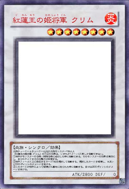炎族チューナー+チューナー以外の炎族モンスター1体以上 「紅蓮王の姫将軍 クリム」の①②の効果は、いずれか1ターンに1度しか発動できない。 ①相手がモンスターの召喚・特殊召喚に成功した時に発動できる。そのモンスターの効果を無効にし、自分のライフをその攻撃力分回復する。 ②相手フィールド上に存在するカード1枚を選択して発動する。選択したカードを破壊し、お互いに1000ポイントのダメージを受ける。 ③このカードが相手によって破壊され墓地に送られた時に発動する。自分は2800ポイントのダメージを受ける。 |