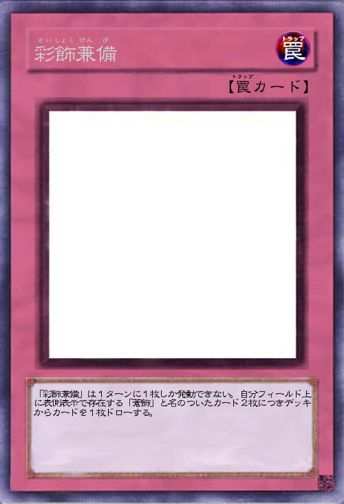 | 「彩飾兼備」は1ターンに1枚しか発動できない。自分フィールド上に表側表示で存在する「蒼飾」と名のついたカード2枚につきデッキからカードを1枚ドローする。 | |||