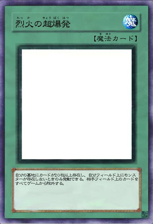| 自分の墓地にカードが20枚以上存在し、自分フィールド上にモンスターが存在しないときのみ発動できる。相手フィールド上のカードをすべてゲームから除外する。 | |||