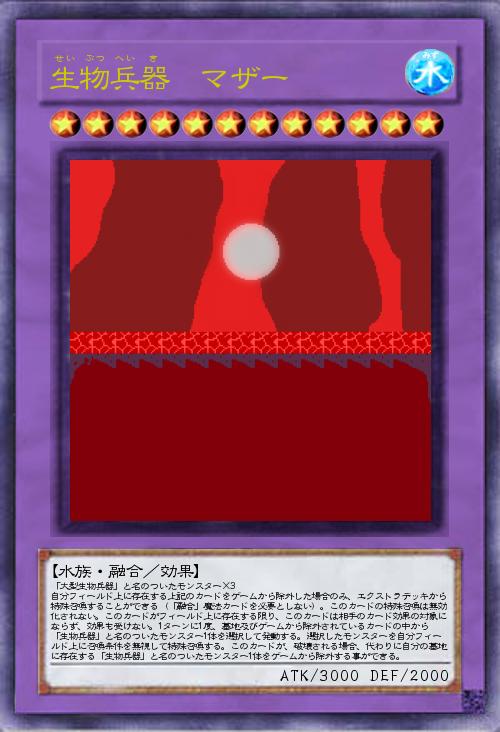 テキストに収まらなかったのですが、(「生物兵器 マザー」と名のついたモンスターはフィールド上に1体しか表側表示で存在できない。)という効果もつけたかったです。」(2015-03-11 16:35)