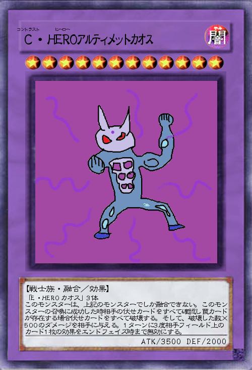 「E・HEROカオス」3体 このモンスターは、上記のモンスターでしか融合できない。このモンスターの召喚に成功した時相手の伏せカードをすべて確認し罠カードが存在する場合伏せカードをすべて破壊する。そして、破壊した数×500のダメージを相手に与える。1ターンに3度相手フィールド上のカード1枚の効果をエンドフェイズ時まで無効にする。 |