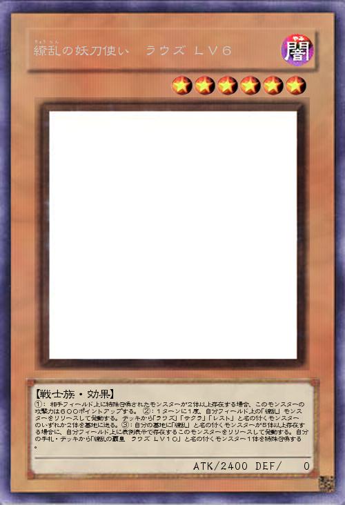 | ①: 相手フィールド上に特殊召喚されたモンスターが2体以上存在する場合、このモンスターの攻撃力は600ポイントアップする。 ②:1ターンに1度、自分フィールド上の「繚乱」モンスターをリリースして発動する。デッキから「ラウズ」「サクラ」「レスト」と名の付くモンスターのいずれか2体を墓地に送る。③:自分の墓地に「繚乱」と名の付くモンスターが5体以上存在する場合に、自分フィールド上に表側表示で存在するこのモンスターをリリースして発動する。自分の手札・デッキから「繚乱の覇皇 ラウズ LV10」と名の付くモンスター1体を特殊召喚する。 | |||