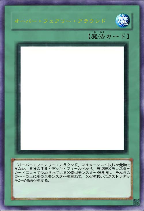 | 「オーバー・フェアリー・アラウンド」は1ターンに1枚しか発動できない。自分の手札・デッキ・フィールドから、天使族Xモンスターカードによって決められているX素材モンスターを選択し、それらのカードの上にそのXモンスターを重ねて、X召喚扱いエクストラデッキから特殊召喚する。 | |||