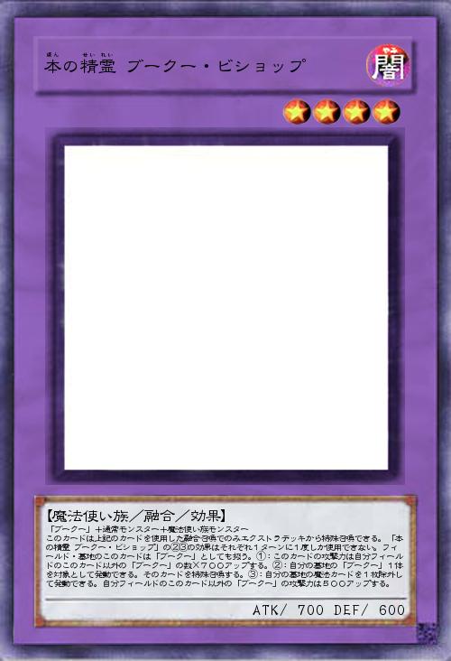 「ブークー」+通常モンスター+魔法使い族モンスター このカードは上記のカードを使用した融合召喚でのみエクストラデッキから特殊召喚できる。「本の精霊 ブークー・ビショップ」の②③の効果はそれぞれ1ターンに1度しか使用できない。フィールド・墓地のこのカードは「ブークー」としても扱う。①:このカードの攻撃力は自分フィールドのこのカード以外の「ブークー」の数×700アップする。②:自分の墓地の「ブークー」1体を対象として発動できる。そのカードを特殊召喚する。③:自分の墓地の魔法カードを1枚除外して発動できる。自分フィールドのこのカード以外の「ブークー」の攻撃力は500アップする。 |