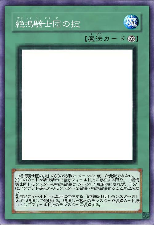 「絶鳴騎士団の掟」の②の効果は1ターンに1度しか発動できない。 ①このカードが表側表示で自分フィールド上に存在する限り、「絶鳴騎士団」モンスターの特殊召喚は1ターンに1度無効にされず、自分はアンデット族以外のモンスターを召喚・特殊召喚することが出来ない。 ②自分フィールド上と墓地に存在する「絶鳴騎士団」モンスターを1体ずつ選択して発動する。選択した墓地のモンスターを装備カード扱いとしてフィールド上のモンスターに装備する。 |