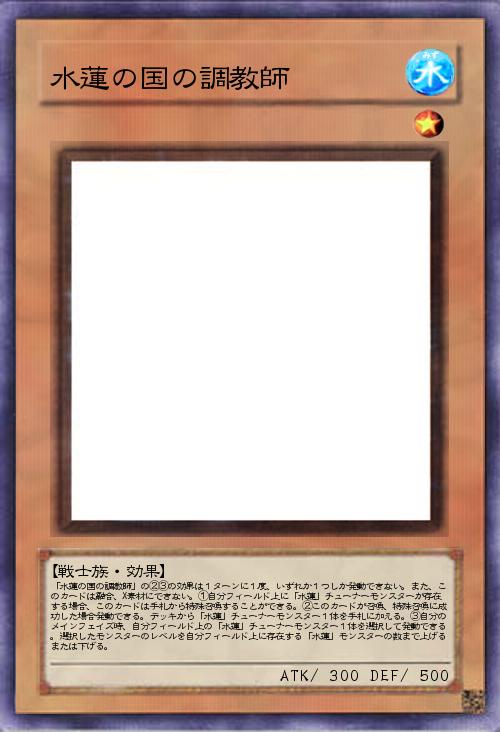 | 「水蓮の国の調教師」の②③の効果は1ターンに1度、いずれか1つしか発動できない。また、このカードは融合、X素材にできない。①自分フィールド上に「水蓮」チューナーモンスターが存在する場合、このカードは手札から特殊召喚することができる。②このカードが召喚、特殊召喚に成功した場合発動できる。デッキから「水蓮」チューナーモンスター1体を手札に加える。③自分のメインフェイズ時、自分フィールド上の「水蓮」チューナーモンスター1体を選択して発動できる。選択したモンスターのレベルを自分フィールド上に存在する「水蓮」モンスターの数まで上げるまたは下げる。 | |||