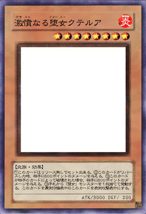 | ①このカードはリリース無しでセット出来る。②このカードがリバースした時、相手に800ポイントのダメージを与える。③このカードが相手のカードによって破壊された場合、相手に800ポイントのダメージを与える。③手札から「堕女」モンスターを1枚捨てて発動する。このカードを裏側守備表示のこのカードを表側攻撃表示にする。 | |||